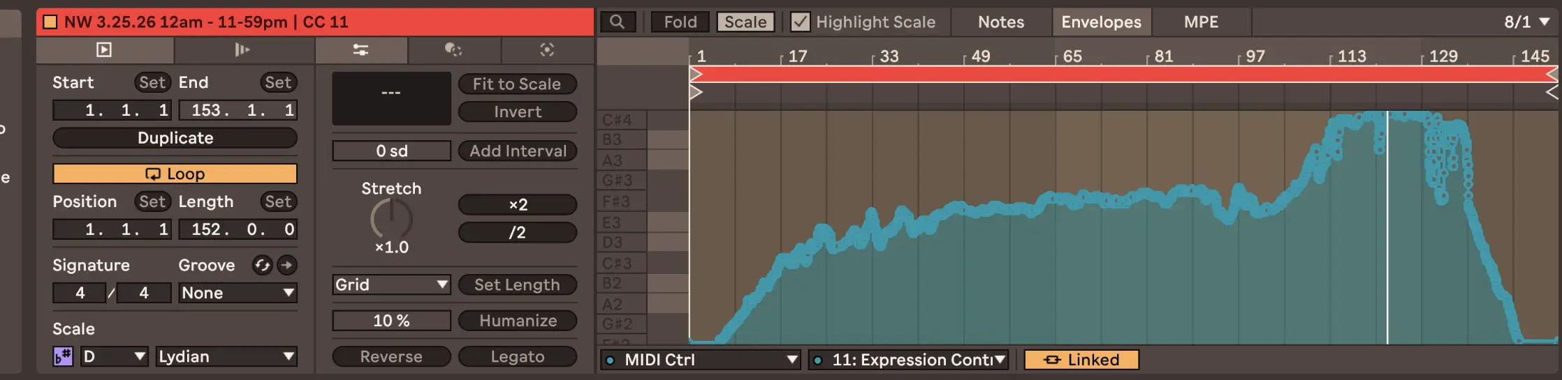 The raw lux readings over time are exported as MIDI CC data continuous control curves that modulate parameters in the composition. We can also use these for automation values. In this way, the light readings can surface within the tracks beyond musical notation.