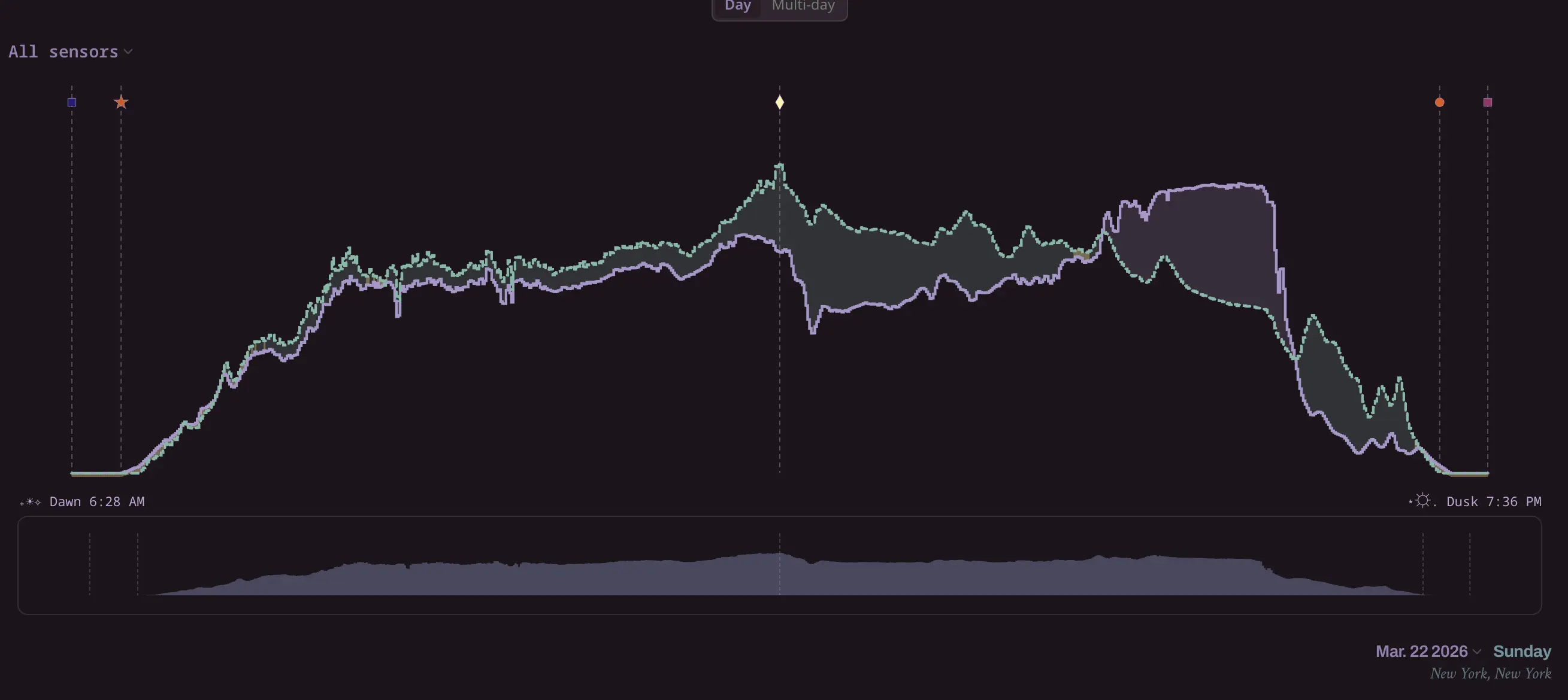 s = sun(LOCATION.observer, date=datetime.now().date(), tzinfo=timezone.utc)This did not work because UTC dawn and dusk is not the same as New York dawn and dusk. So we lost some morning readings on April 13 as I slept through it.