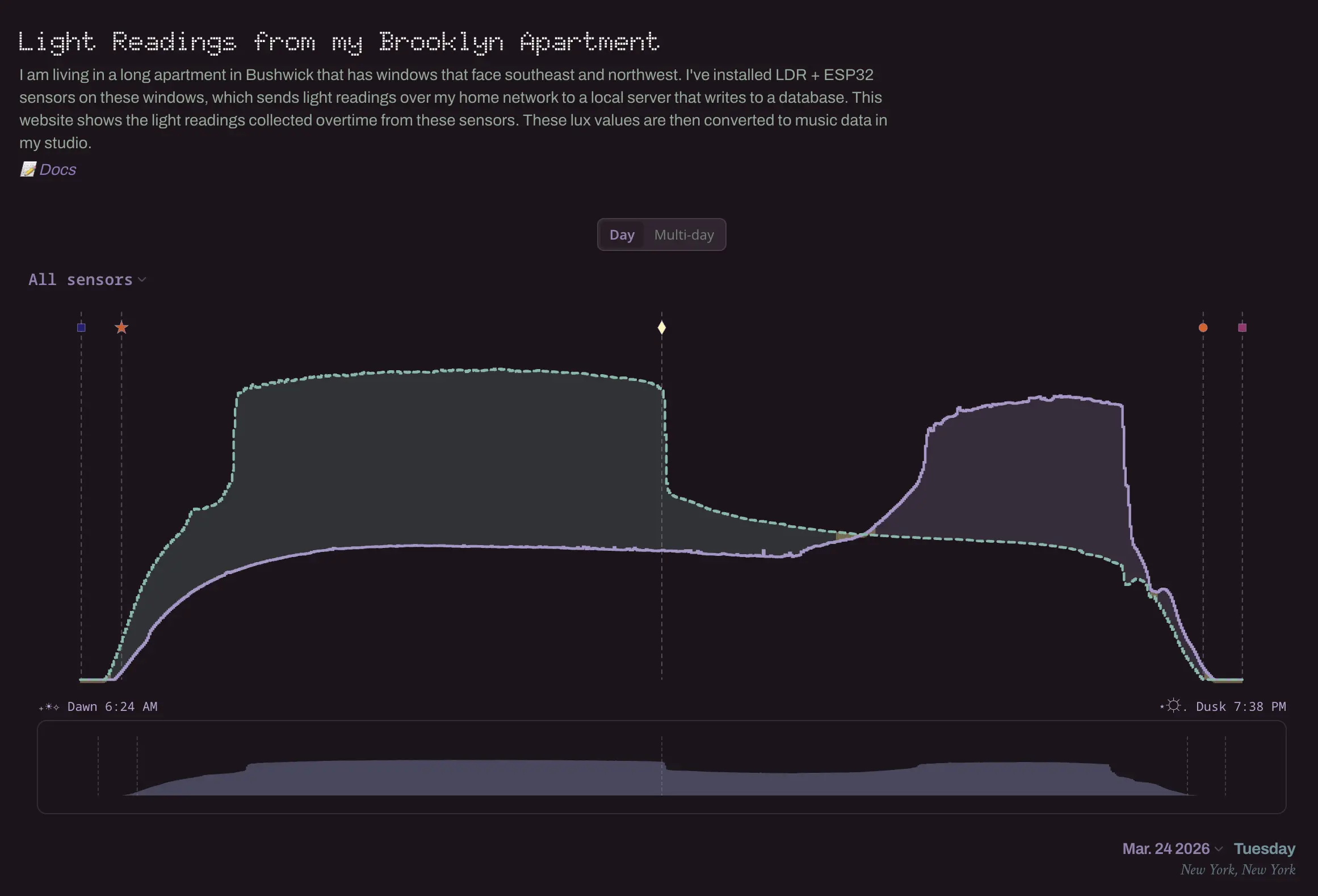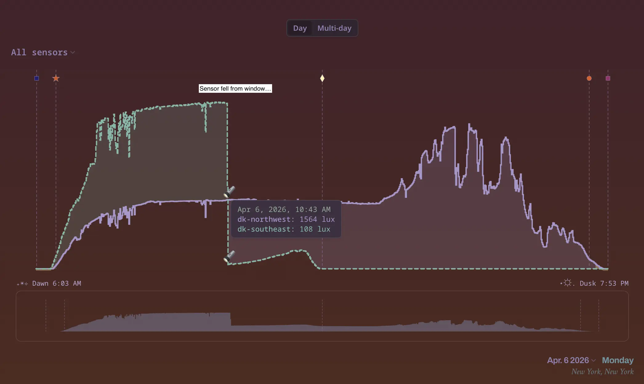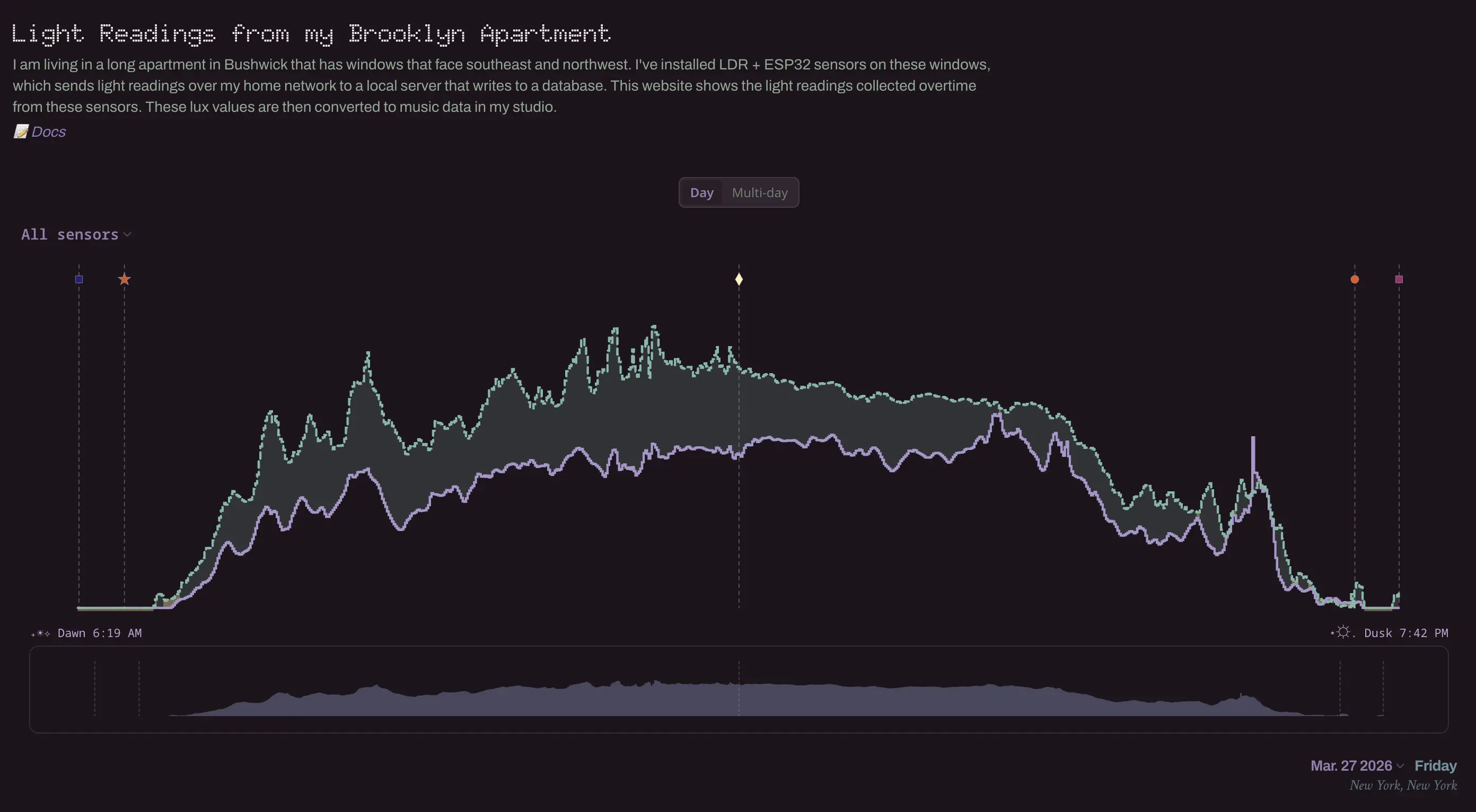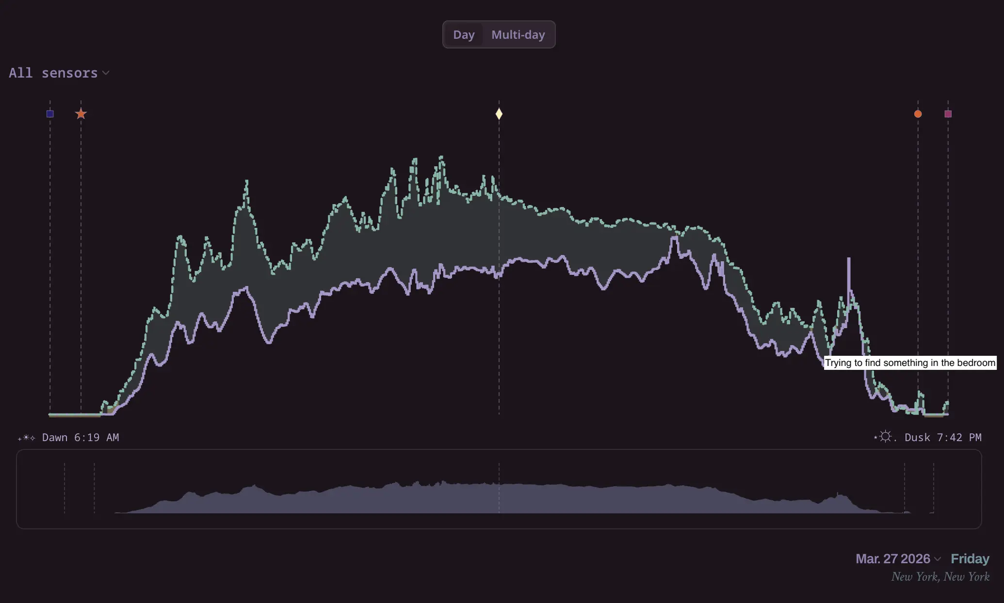 For the dashboard, I wanted to stay minimal and let the light data take up most of the attention. I opted to remove axis labels and other informational overhead since, at a glance, we really just care about the shape of the light and not the exact values. You can still get the lux values as you hover over the sensor data, which also changes the background of the site to match the specific light levels for that day.