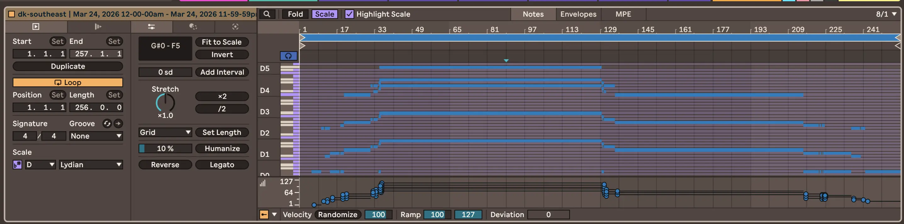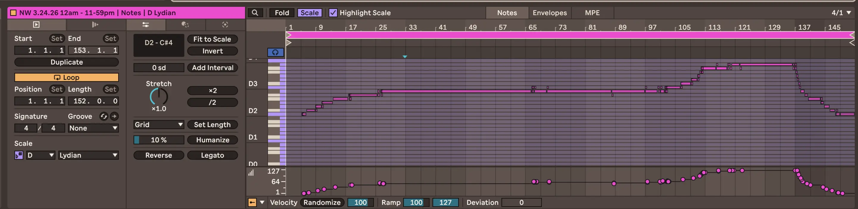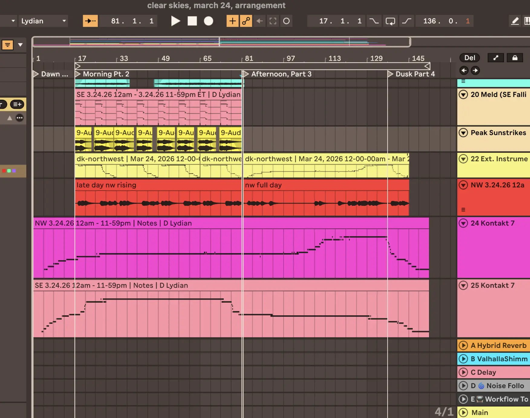 Lux-derived MIDI note data in D Lydian, from March 24, 2026 (clear skies).