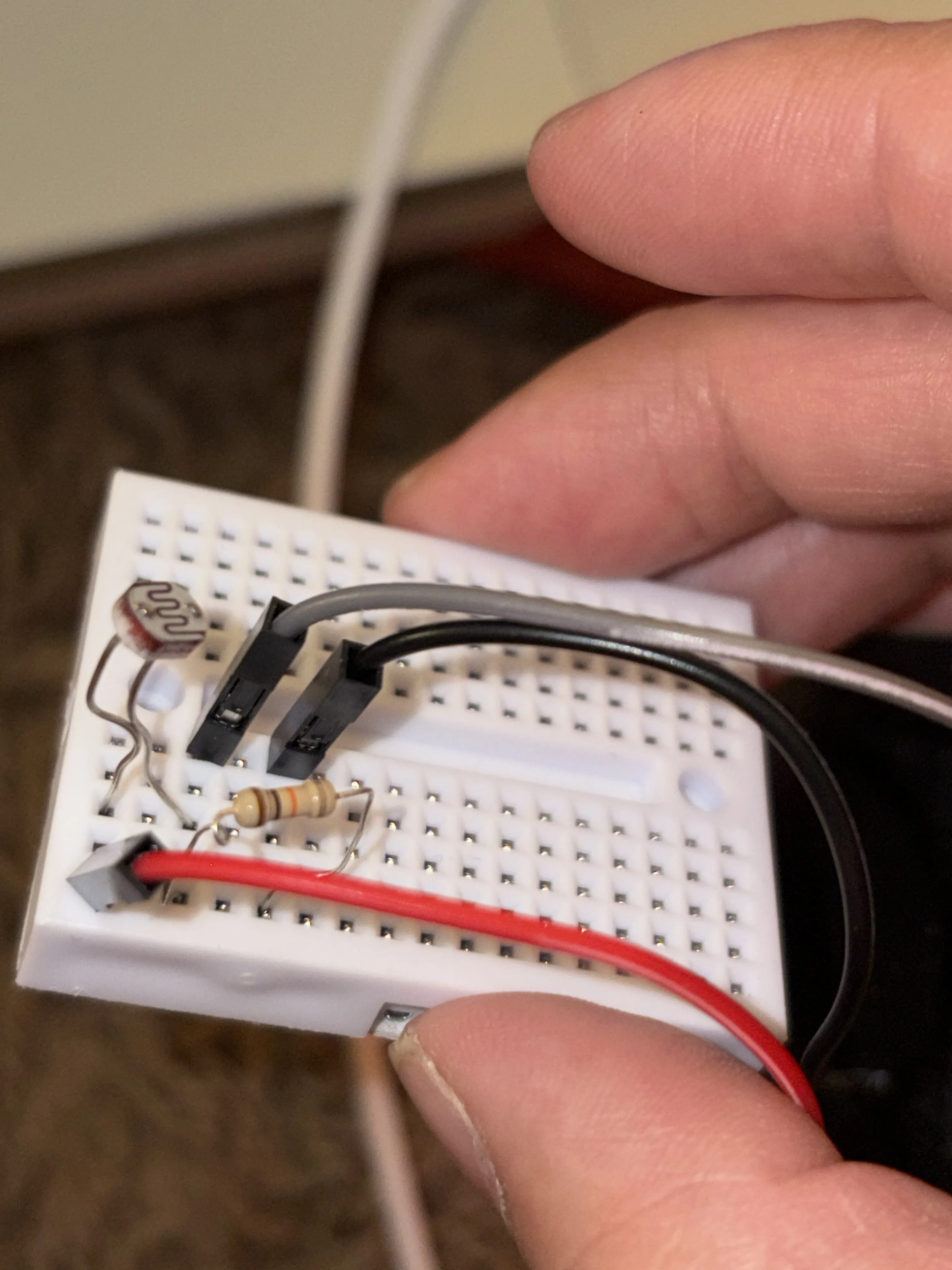 The lux sensor board sits in a simple divider network so the ADC sees a comfortable voltage swing for daylight shifts. Once I had the initial circuit connected in the breadboard, I used an iPhone flashlight to test it out and get my first readings.